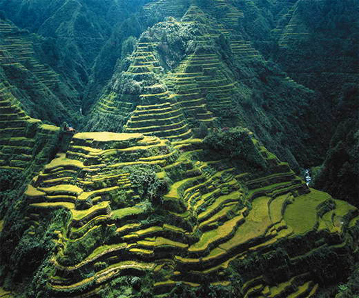 Yang pertama adalah Banaue Rice Terraces yang terletak di filiphina. teras ini sudah berusia sekitar 2000 tahun, teras ini diukir di pegunungan Ifugao di Filipina oleh nenek moyang orang-orang pribumi. Rice Terraces biasanya disebut oleh Filipina sebagai "Eighth Wonder of the World".